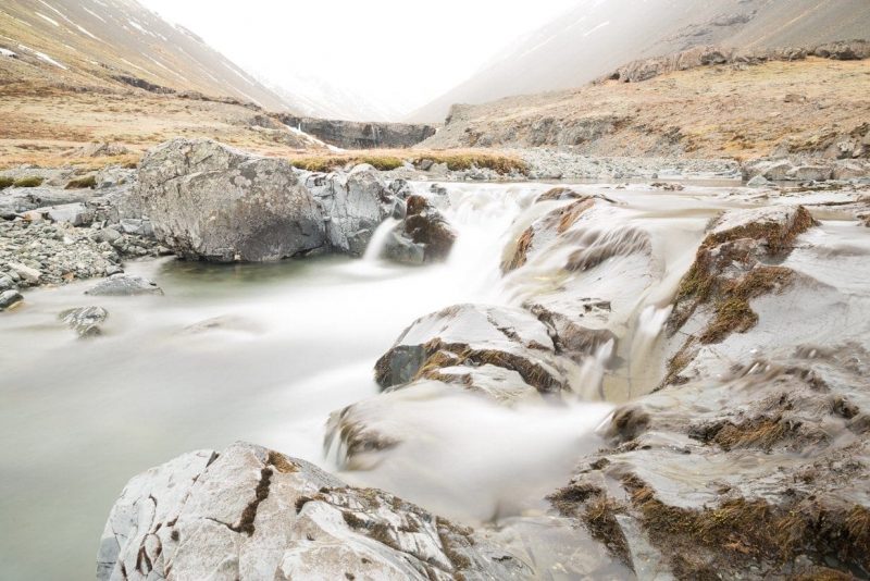 This tutorial is a demonstration of the Magic Cloth Technique to add drama to a dull sky. I was in Skutadalur on the East Iceland Coast. The valley is rich for nature photography and has waterfalls all the way through it. For this scene, I set up my tripod near t this low-level waterfall. I like the way boulders form a shape that frames the tiny waterfall. It is a grey day and the distant mountains are really washed out.
